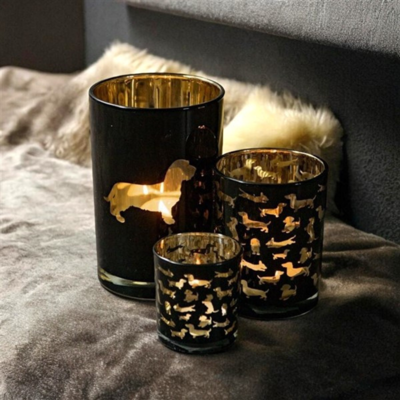 Unser schwarzes Windlicht mit goldenem Dackel-Silhouettenschnitt ist die perfekte Kombination aus Stil, Charme und einem Hauch Hundeliebe.