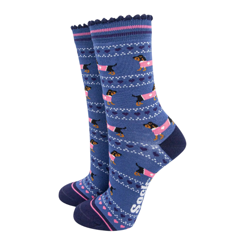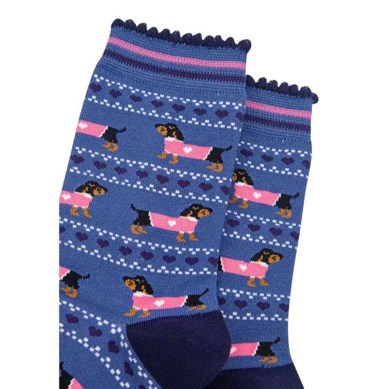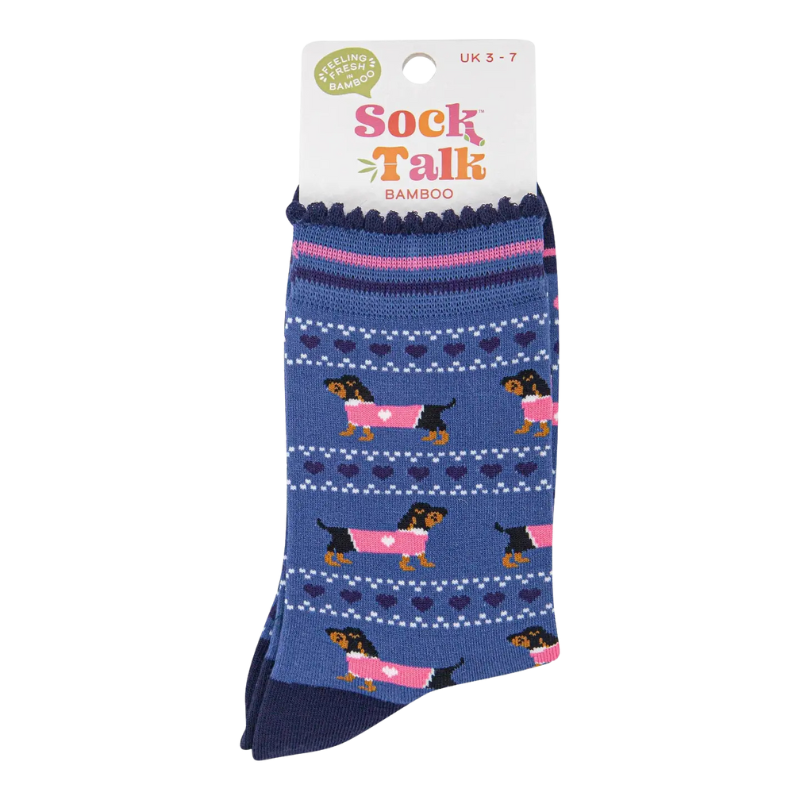 Mit entzückenden Dackeln in leuchtend pinken Mänteln, sind diese originellen Socken für Hundefreunde entworfen. Hergestellt aus nachhaltig gewonnenen Bambusfasern bieten diese Knöchelsocken außergewöhnliche Weichheit und Atmungsaktivität. Abgeschlossen mit einem gewellten Bündchen für eine luxuriös bequeme Passform.