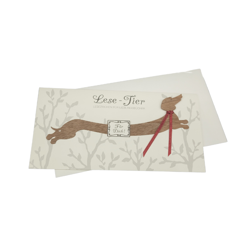 Lesezeichen / Lese-Tier Holzdackel mit Karte und Umschlag